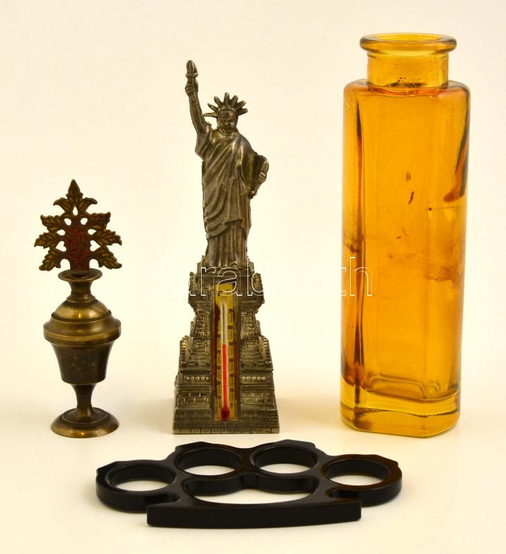 Beschreibung: Vegyes bolha tétel, összesen 4 db: boxer, kisméretű üveg váza, réz dísztárgy, Szabadságszobor hőmérő