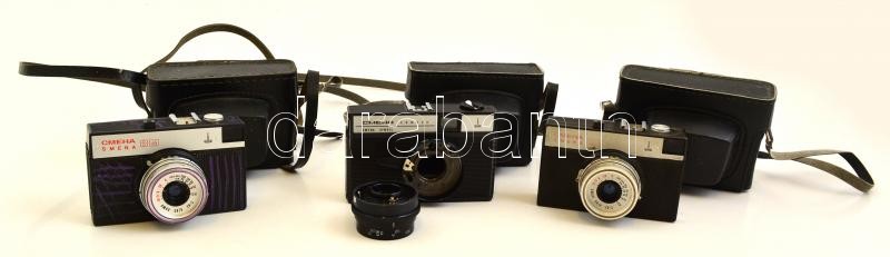 Beschreibung: Vegyes fényképezőgép tétel: 3 db Smena 8M és Symbol eredeti tokjukban, Hanimex X150 vaku, a fényképezők vegyes állapotban