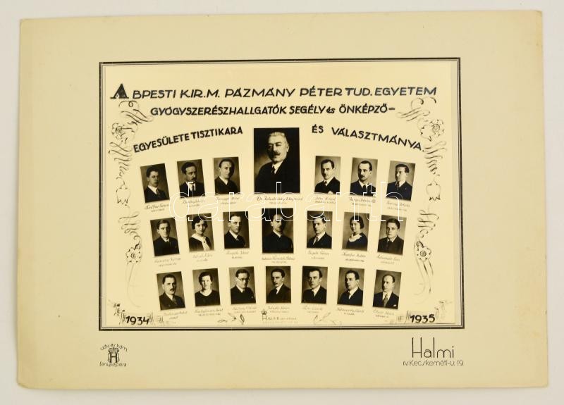 1935 Budapesti Kir. Magyar Pázmány Péter Tudományegyetem végzett gyógyszerészhallgatók segély és önképző egyesülete tisztikara és választmánya, tablókép, Halmi műterméből, kartonra kasírozva, 17,5x23 cm