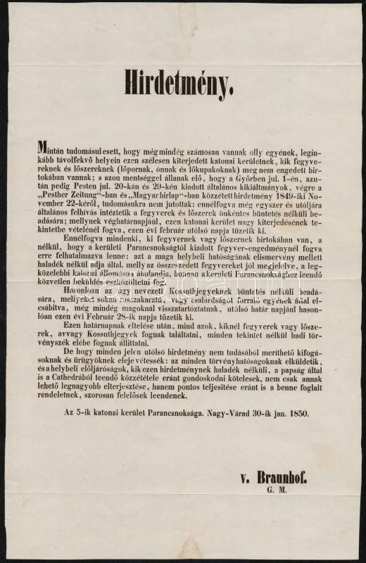 1850 Hirdetmény az 1848-49-es szabadságharc fegyvereinek beszolgáltatá... https://www.darabanth.com/de/312-Fernauktion/312.0/Andere-Sammelgebiete/Historische-Dokumenten-Handschriften~17/1850-Hirdetmeny-az-1848-49-es-szabadsagharc-fegyvereinek-beszolgaltatasarol-valamint-a-Kossut~II1710719