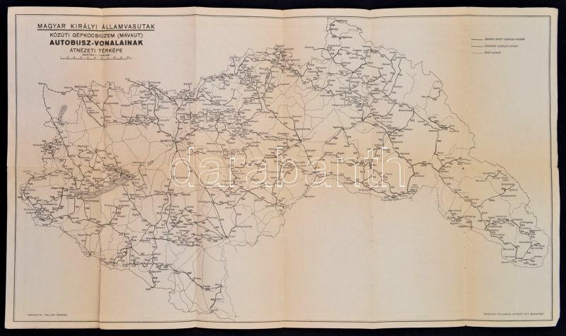 1941 A Magyar Királyi Államvasutak közúti gépkocsiüzem (MÁVAUT) autóbuszvonalainak átnézeti térképe és vasúti hálózati térképe, két oldalas térkép, Magyar Földrajzi Intézet Rt., 58x33 cm