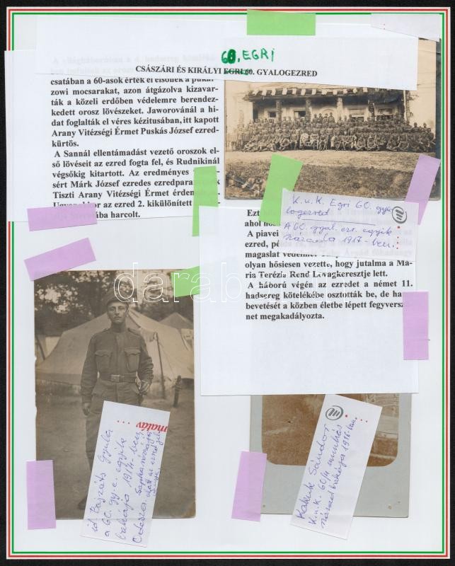 Beschreibung: 1917 A 60. egri, cs. és kir. gyalogezred története- Gyűjtemény kezdemény 6 db érdekes eredeti fotóval és képeslappal, szöveggel, két tablón.