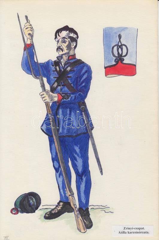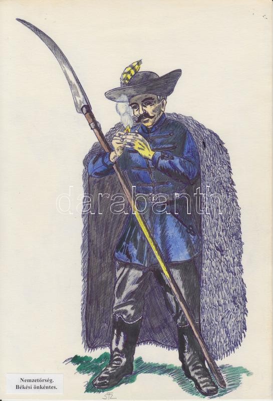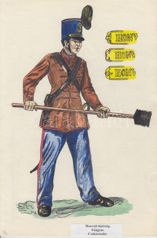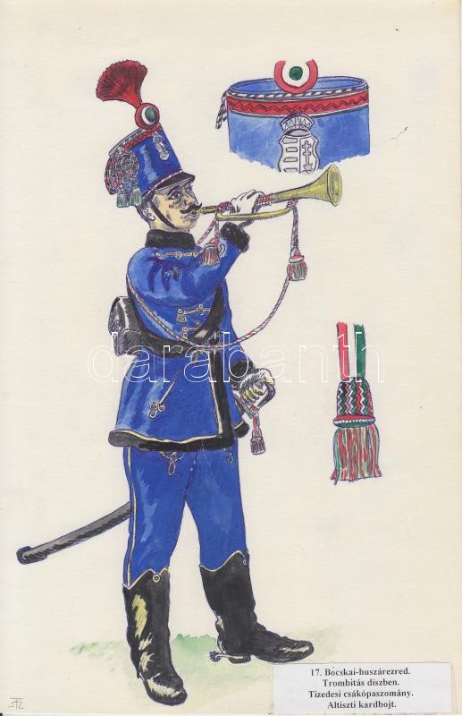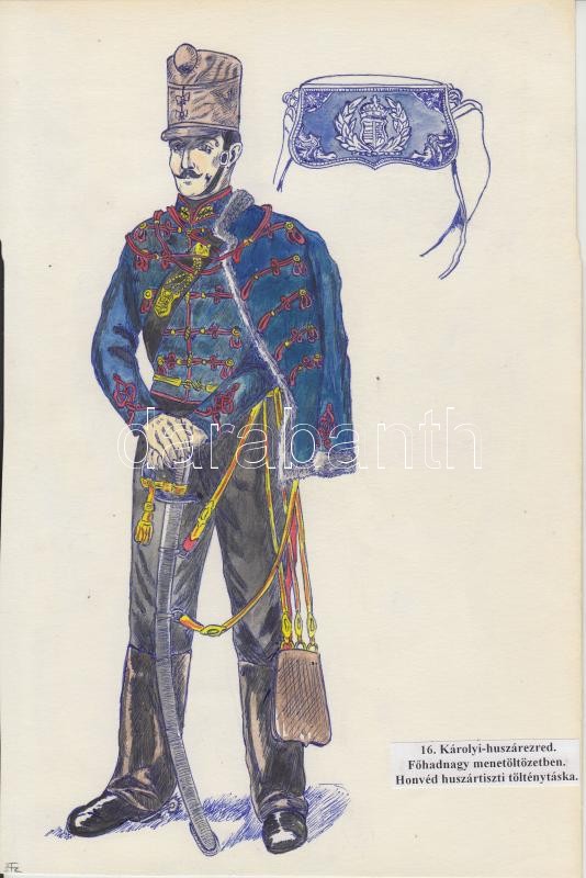Katonai egyenruhák 9 db jezett akvarell a magyar katonaság történetéről. Különböző alakulatok és fegyvernemek. / Military uniforms. 9 water color drawings 20x30 cm