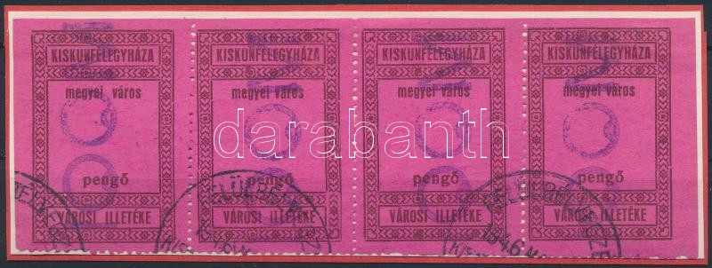 Beschreibung: 1946 Kiskunfélegyháza R.T.V 145 sz. okirati illetékbélyeg négyescsíkban (6.000)