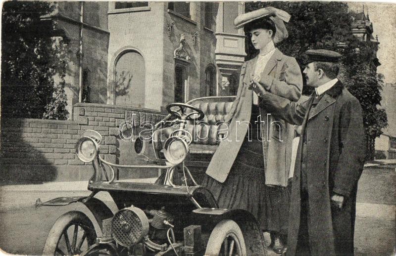 Beschreibung: Hölgy és sofőrje automobillal / Lady and her driver with automobile