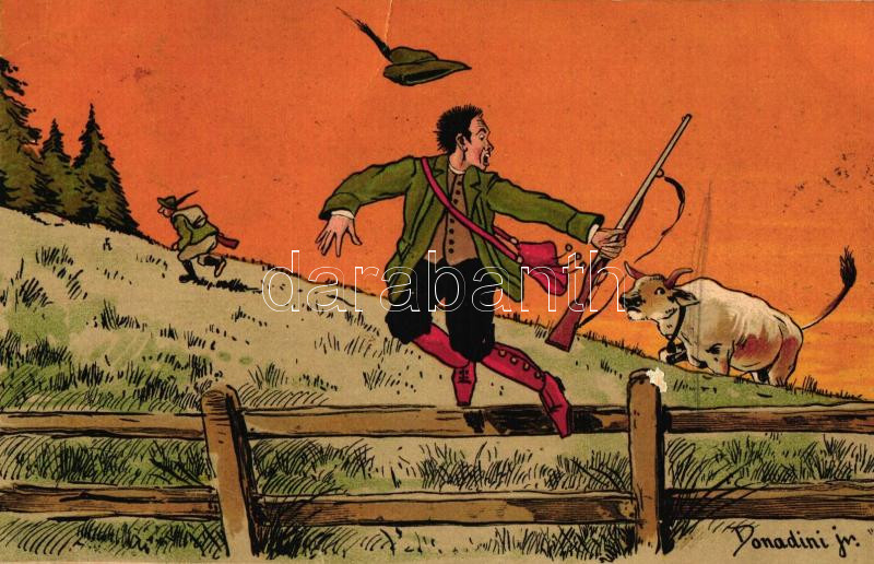 Hunter, bull, humour, K& B.D. Serie 4543. litho s: Donadini (EB) https://www.darabanth.com/de/312-Fernauktion/312.0/Ansichtskarten/Jagd~500050/Hunter-bull-humour-K-BD-Serie-4543-litho-s-Donadini-EB~II1099909