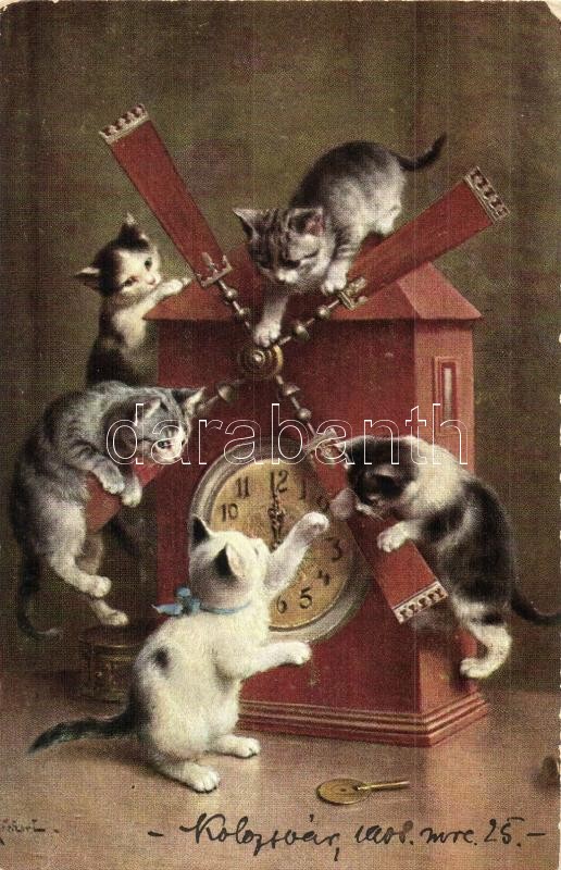 Cats playing with clock. T. S. N. Serie 649. No. 2. (EK) https://www.darabanth.com/de/312-Fernauktion/312.0/Ansichtskarten/Katzen~500037/Cats-playing-with-clock-T-S-N-Serie-649-No-2-EK~II1710706