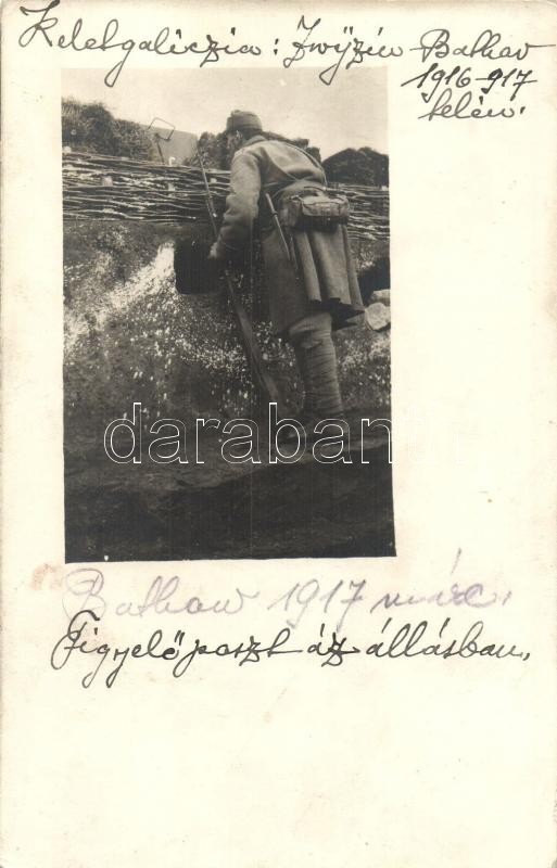 1917 Kelet-Galícia. Batkow (Batykiv), megfigyelési pont az állásban, lövészárok / WWI Austro-Hungarian K.u.K. military trenches, soldier with rifle at the observation point. photo (EK)