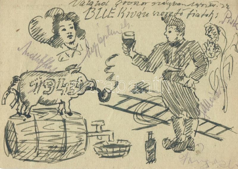 1942-43 BÚÉK! Valahol Oroszországban. Kézzel rajzolt Tábori Postai Levelezőlap / WWII Hungarian military field post with hand-drawn art, New Year greeting from Russia (EK)