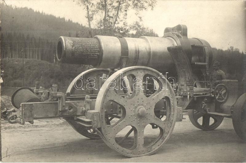Osztrák-magyar mozsárágyú keréken, csőre vésve a bevetés helyei (Isonzó, Galícia, Südtirol, Görz, stb.) / WWI Austro-Hungarian K.u.K. military mortar on wheels, engraved the locations where it served. photo