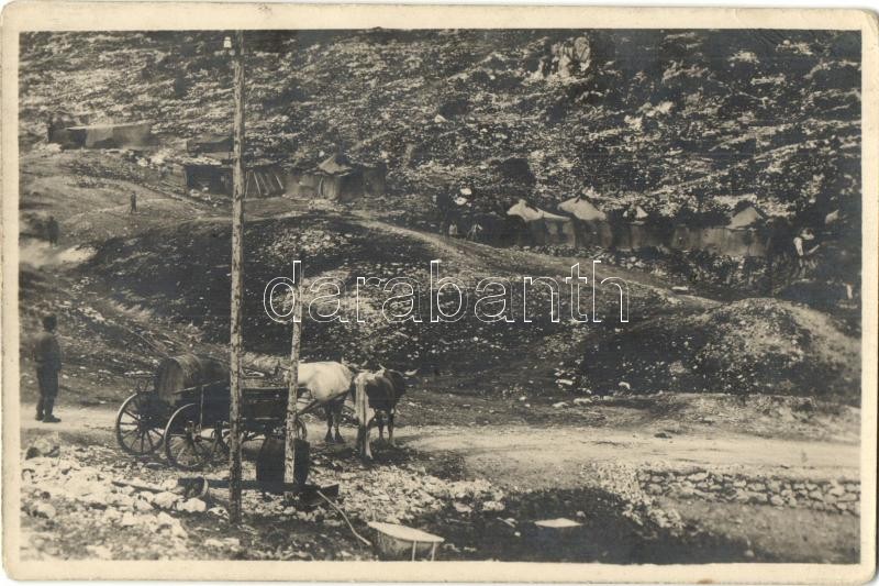 Vízszállítás ökrökkel a tábori pékségbe (Divisions-Bäckerei), amit meredek sziklák védenek gránátoktól / WWI Austro-Hungarian K.u.K. military camp's bakery water transport with ox carts. photo (EK)