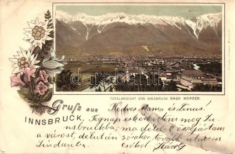 Beschreibung: Innsbruck, panorama. Ottmar Zieher floral Art Nouveau litho (kis szakadás / small tear)