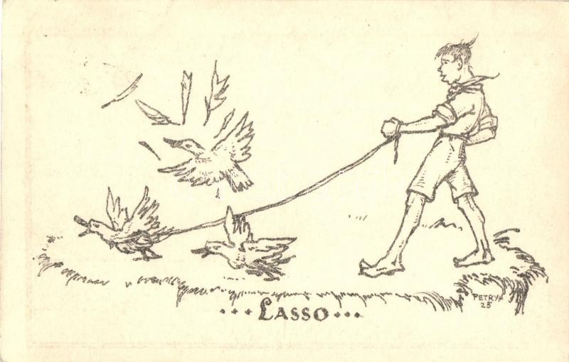 Lasszó. Cserkész művészlap / Lasso. Hungarian boy scout art postcard s... https://www.darabanth.com/de/312-Fernauktion/312.0/Ansichtskarten/Pfadfinder~500018/Lasszo-Cserkesz-muveszlap-Lasso-Hungarian-boy-scout-art-postcard-s-Petry-EK~II1711573