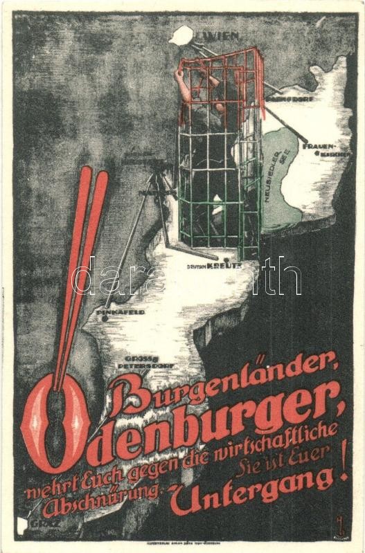 Burgenländer, Odenburger, wehrt Euch gegen die wirtschaftliche Abschnürung. Sie ist Euer Untergang! Anläßlich der Befreiung des Burgenlandes: Der Ödenburger Heimatdienst. / Burgenland felszabadítása alkalmából: a soproni hazaszolgálat / On the occasion of the liberation of Burgenland: the Ödenburg homeland service. Kunstverlag Amon Göth