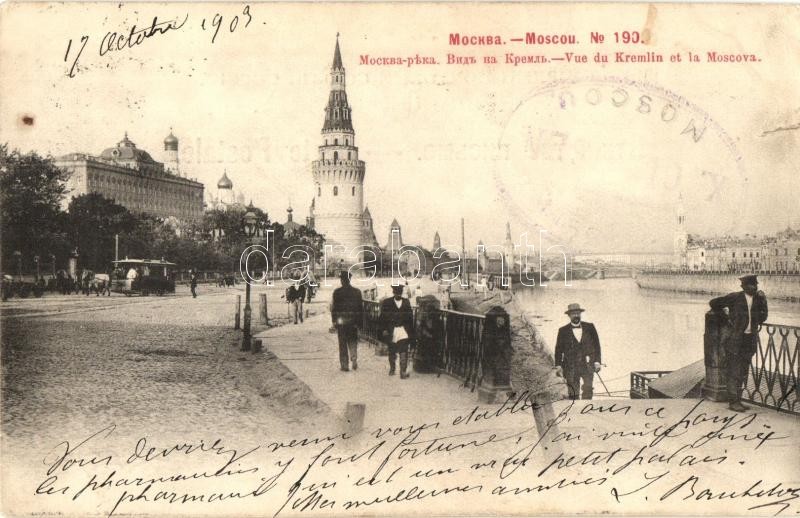 Moscow, Moskau, Moscou; Vue du Kremlin et la Moscova / Kremlin, Moskva river, horse-drawn tram. Phototypie Scherer, Nabholz & Co. (ázott sarok / wet corner)