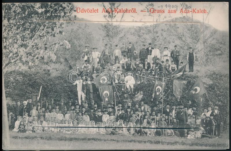 Ada Kaleh, Törökök csoportképe zászlókkal. leporellólap benne: vár, pipázó törökök, bazárok, mecset, Bego Mustafa. Ali Mehmed kiadása / Turkish group picture with flags. leporellocard with castle, pipe smoking Turkish men, bazaars, shops, mosque inside