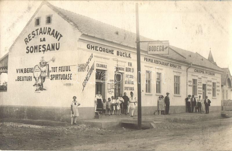 Aranyosgyéres, Campia Turzii; Gheorghe Bucila első román étterme a Szamosnál / Restaurant la Somesanu, Primul Restaurant Roman, Crisma in Drum / the first Romanian restaurant by the Somes river, shops. photo (ragasztónyom / glue mark)
