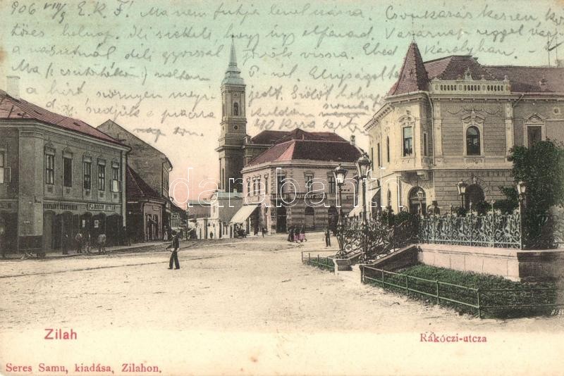 Beschreibung: Zilah, Zalau; Rákóczi utca, Ifj. Bokor István, Materny János üzletei. Seres Samu kiadása / street view, shops (EK)