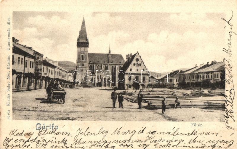 Beschreibung: Bártfa, Bardejov, Bardiov; Fő tér, építkezés, üzletek, templom. Salgó Mór kiadása / main square, construction, shops, church