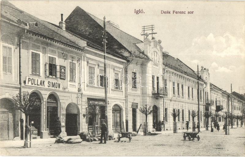 Igló, Iglau; Deák Ferenc sor, Anker biztosító, Pollak Simon, Wittman Károly üzletei, szabóság. Divald Károly fia kiadása / street view, shops, tailor, insurance company (EK)