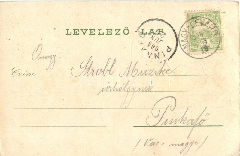 Nagylévárd, Velké Leváre; templom, Gróf Wenckheim kastély, Vasútállomás, Ménes, Hubertinum és Fő utca / Kirche, Schloss, Bahnhof, Gestütt / church, castle, railway station,stud farm, main street. Karl Schwidernoch floral Art Nouveau litho (EK)