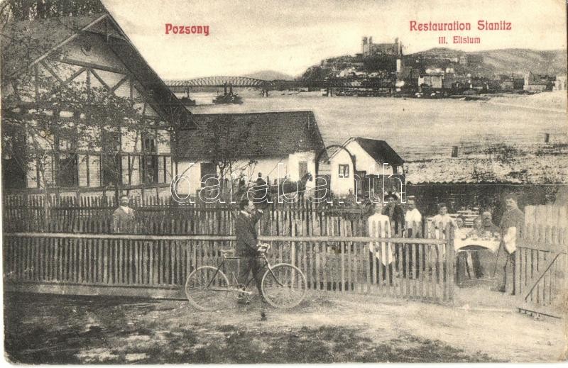 Beschreibung: Pozsony, Pressburg, Bratislava; Restauration Stanitz III. Eltsium / Stanitz étterem, kerthelyiség, kerékpár / restaurant, garden, bicycle (EK)