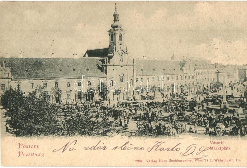 Beschreibung: Pozsony, Pressburg, Bratislava; Vásártér, piac, árusok. Hans Nachbargauer kiadása / Marktplatz / market square, vendors