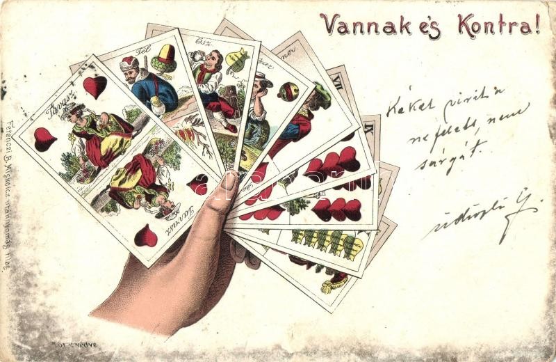 Vannak és Kontra! Magyar kártyás képeslap. Ferenczi B. kiadása / Hunga... https://www.darabanth.com/de/312-Fernauktion/312.0/Ansichtskarten/Spielkarten~500030/Vannak-es-Kontra-Magyar-kartyas-kepeslap-Ferenczi-B-kiadasa-Hungarian-cards-litho-EK~II1706678