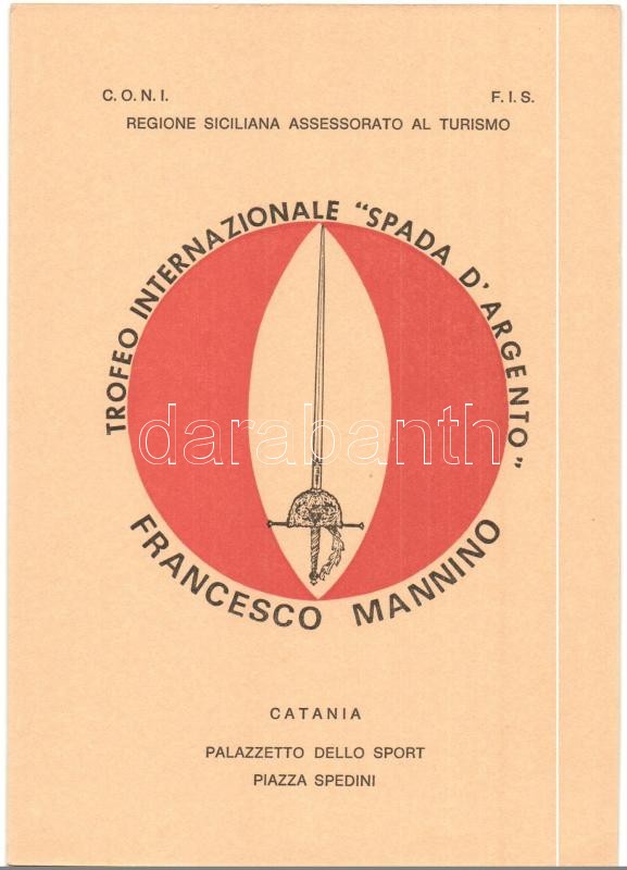 Trofeo Internazionale Spada d'Argento. Francesco Mannino. Catania, Palazzetto dello Sport, Piazza Spedini (Federazione Italiana Scherma) / Az Olasz Vívószövetség nemzetközi versenyének reklámlapja, vívás / International Silver Sword Trophy. Italian Fencing Federation (EK)