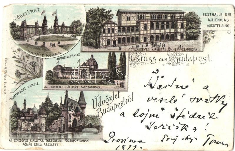 1897 (Vorläufer!) Budapest XIV. Az Ezredéves Kiállítás Ünnepi Csarnoka, Főbejárat, Iparcsarnok, Történelmi Főcsoport román stílusú részlete, Vajdahunyad vára. Eisler G. floral Art Nouveau litho (b)