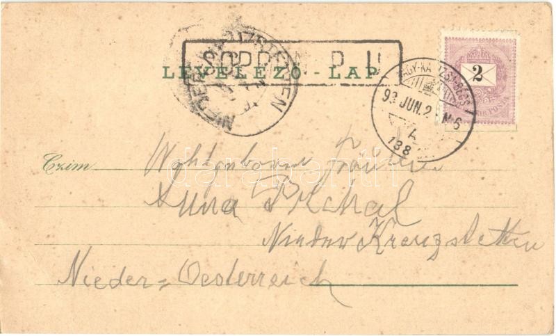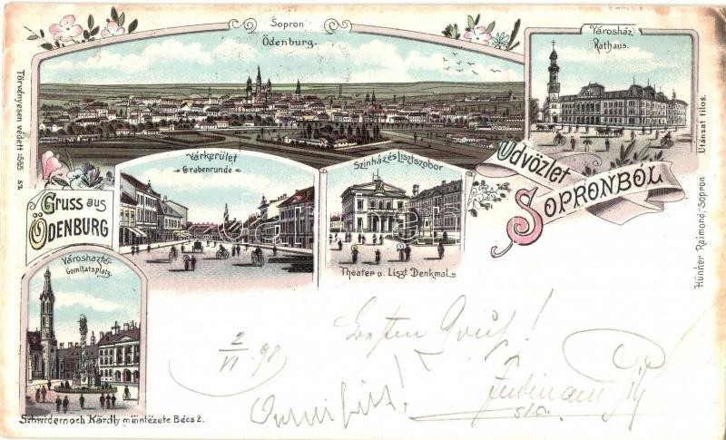 1899 Sopron, Várkerület, Színház és Liszt Ferenc szobor, Városháza, Szentháromság-szobor. Hünner Raimond, Schwidernoch Károly floral Art Nouveau litho (EB)