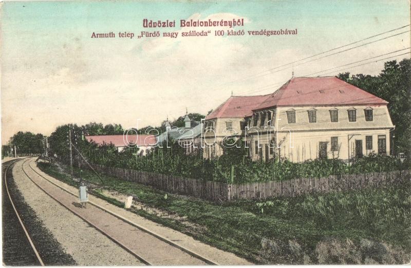 Balatonberény, Armuth-telep Fürdő nagy szálloda, vasúti sínek https://www.darabanth.com/de/312-Fernauktion/312.0/Ansichtskarten/Ungarn~500006/Balatonbereny-Armuth-telep-Furdo-nagy-szalloda-vasuti-sinek~II1707890