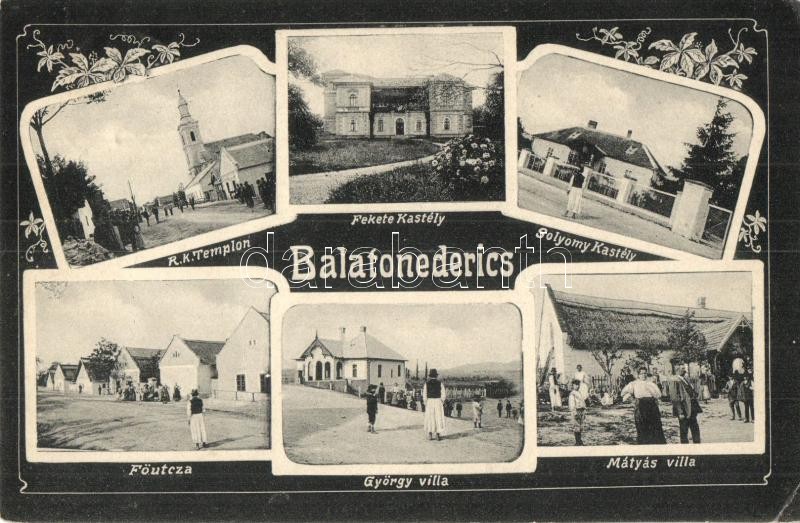 Balatonederics, Római katolikus templom, Fekete kastély, Solyomy kastély, Fő utca, György villa, Mátyás villa. Mérei Ignác kiadása, floral Art Nouveau (EK)