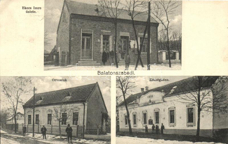 Beschreibung: Balatonszabadi, Ekecs Imre üzlete, Orvoslak, Községháza, Kálmán fényképész kiadása (EK)