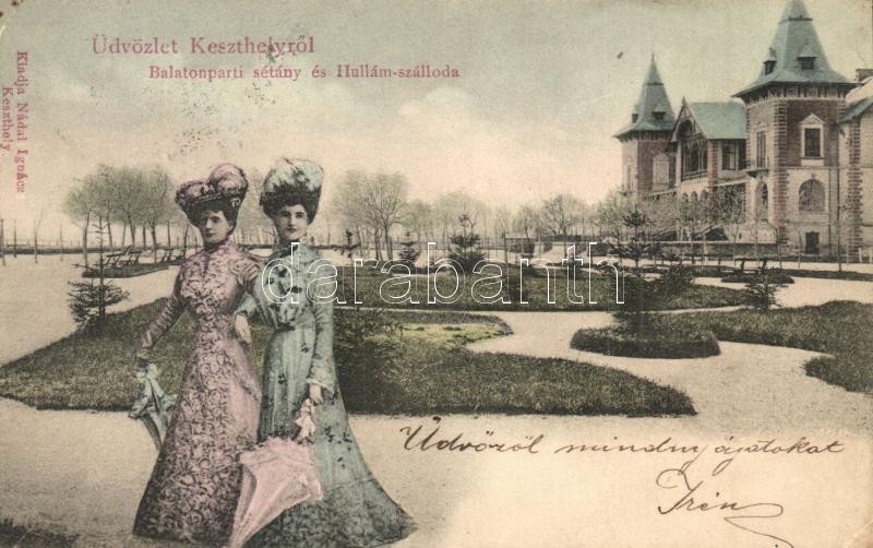 Beschreibung: Keszthely, Balaton parti sétány, Hullám szálloda. Nádai Ignác kiadása, hölgyek montázsa (EK)