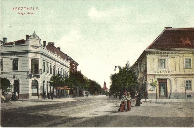 Beschreibung: Keszthely, Nagy utca, Hungária szálloda, Gyógyszertár, Balatoni Múzeum Egyesület székháza. Dr. Trenkler és Társa kiadása (EK)