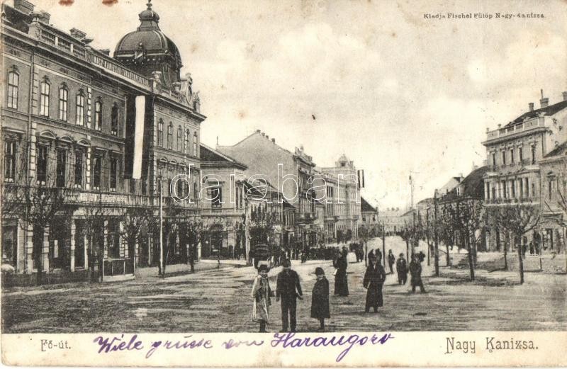 Beschreibung: Nagykanizsa, Fő út, Takarékpénztár, üzletek. Fischel Fülöp kiadása (fl)