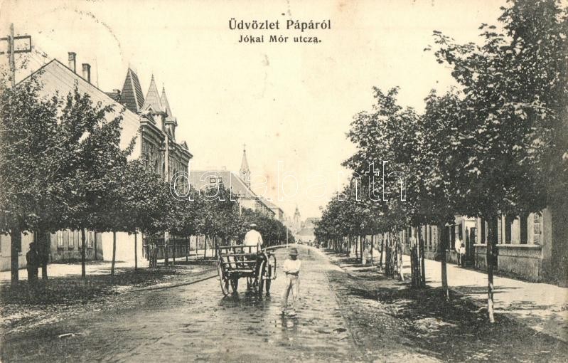 Pápa, Jókai Mór utca, lovasszekér. Kis Tivadar kiadása (EK) https://www.darabanth.com/de/312-Fernauktion/312.0/Ansichtskarten/Ungarn~500006/Papa-Jokai-Mor-utca-lovasszeker-Kis-Tivadar-kiadasa-EK~II1706267