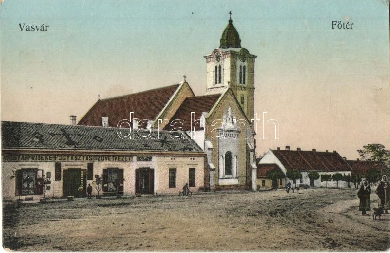Beschreibung: Vasvár, Fő tér, kerékpár, Fogyasztási szövetkezet üzlete és saját kiadása (kis sarokhiány / small corner shortage)