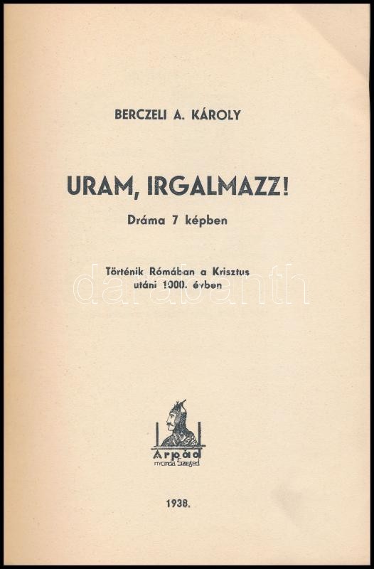 Berczeli A. Károly: Uram, irgalmazz! Dráma 7 képben. Történik Rómában a Krisztus utáni 1000. évben. Bordás Ferenc által illusztrált borítóban. Szeged, 1938, (Magyar Téka), Árpád Nyomda-ny., 79 p.+1sztl. lev. Kiadói illusztrált papírkötés, részben felvágatlan lapokkal.
