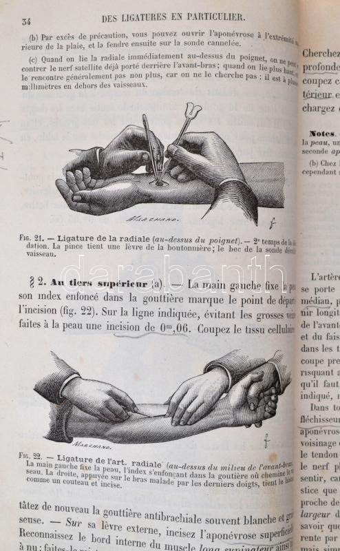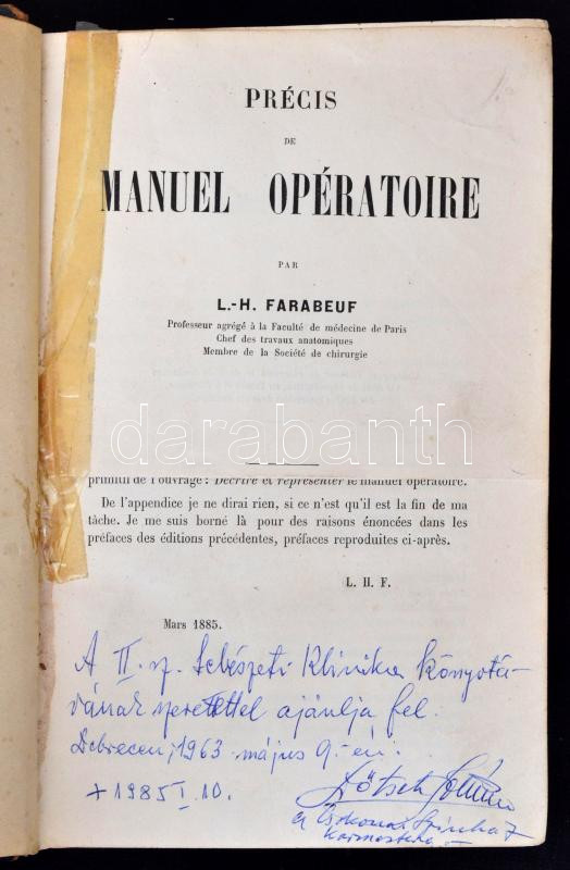 L.H. Farabeuf (szerk.): Précis Manuel Opératoire. Kiadó, kiadási évszám hiányzik.Cca. XIX. század vége. XX. század eleje. Kiadói félbőr kötés, XIV+896 p. Számos illusztrációval. Francia nyelvű sebészeti munka. A borítója viseltes, kopott, sérült. A címoldal fele hiányzik. A másik felét cellux-szal vissza ragasztották. A címoldalt követő oldalon magyar nyelvű ajándékozási sorok. / Surgical work in french language from the end of 19th century, or the beginning of the 20th century. The cover and the front page is damaged.