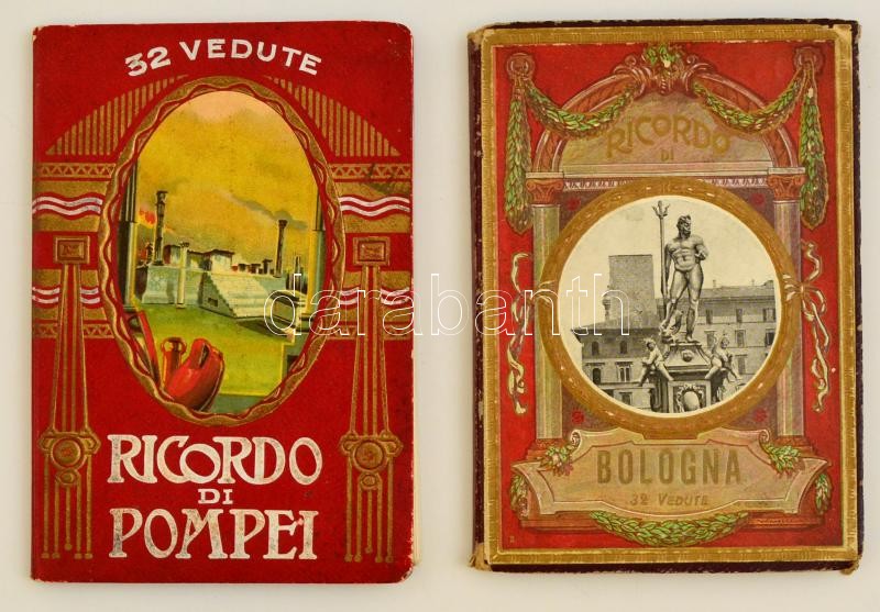 Vegyes könyvtétel, 2 db: Ricordo di Pompei. 31 fotóval. Olasz, francia, angol, és német feliratokkal. Leporellófüzet, egy lap hiányzik, egy javított, a fotók elváltak a kötéstől. Ricordo di Bologna. 32 fotóval. Olasz, francia, angol, és német feliratokkal. Leporellófüzet, kissé kopott borítóval.