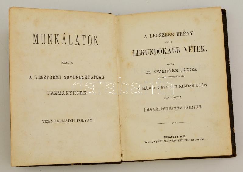 Dr. Zwenger János: A legszebb erény és a legundokabb vétek. Fordította: A Veszprémi Növendékpapság Pázmányköre. Bp., 1879, Hunyadi Mátyás-ny.,XVIII+471+7 p. Átkötött félvászon-kötés, kopott borítóval, kissé sérült gerinccel, belül jó állapotban.