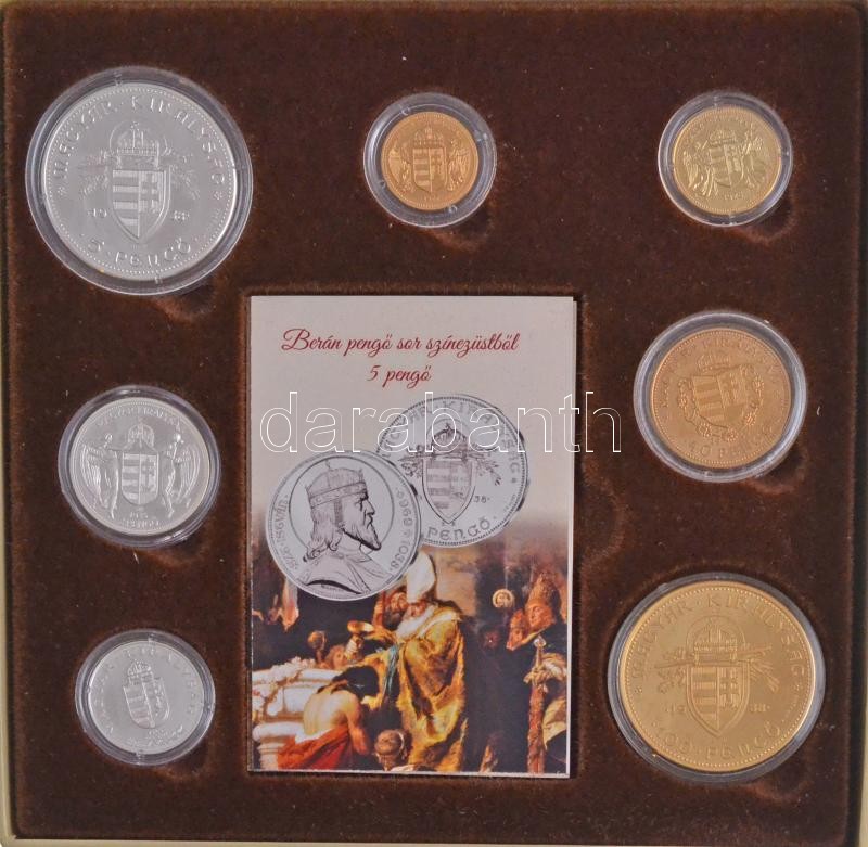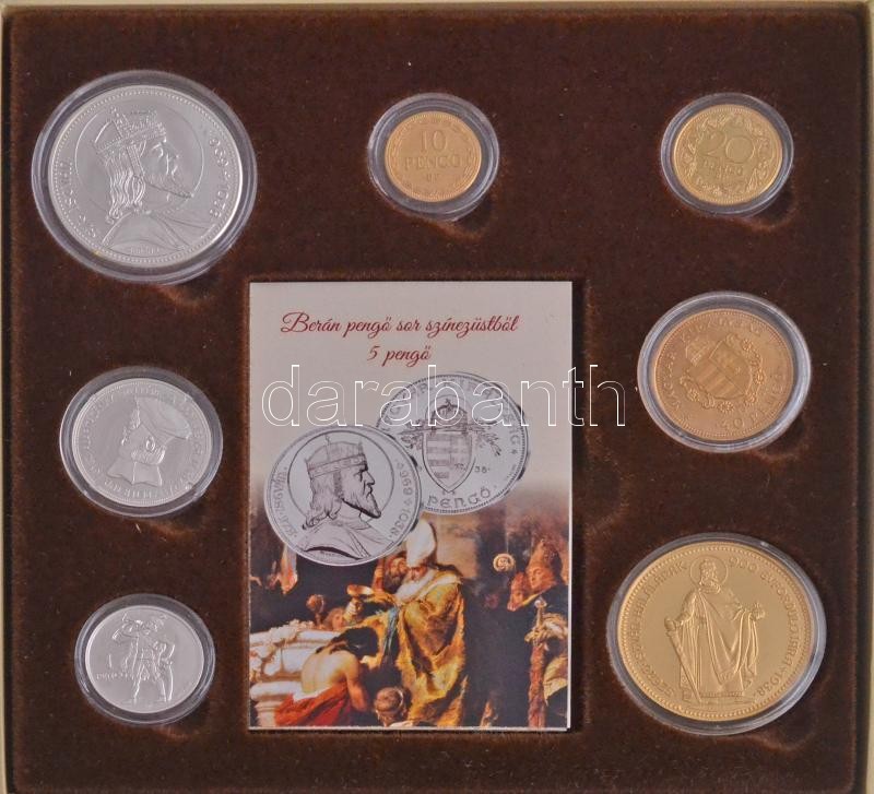 DN "Berán Pengő Sor színezüstből" a Berán Lajos által tervezett pengő pénzérmék Ag és aranyozott Ag utánveretei (7xklf), tanúsítvánnyal díszdobozban (összsúly: 89,9g/0.999) T:PP