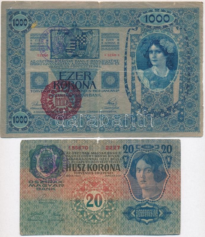 1902. 1000K piros "MAGYARORSZÁG" körbélyegzővel + 1913. 20K ... https://www.darabanth.com/de/312-Fernauktion/312.0/Numismatik/Ungarische-Banknoten~400007/1902-1000K-piros-MAGYARORSZAG-korbelyegzovel-plus-1913-20K-mindketto-hamis-Temes-Varmegye-VC3~II1708522