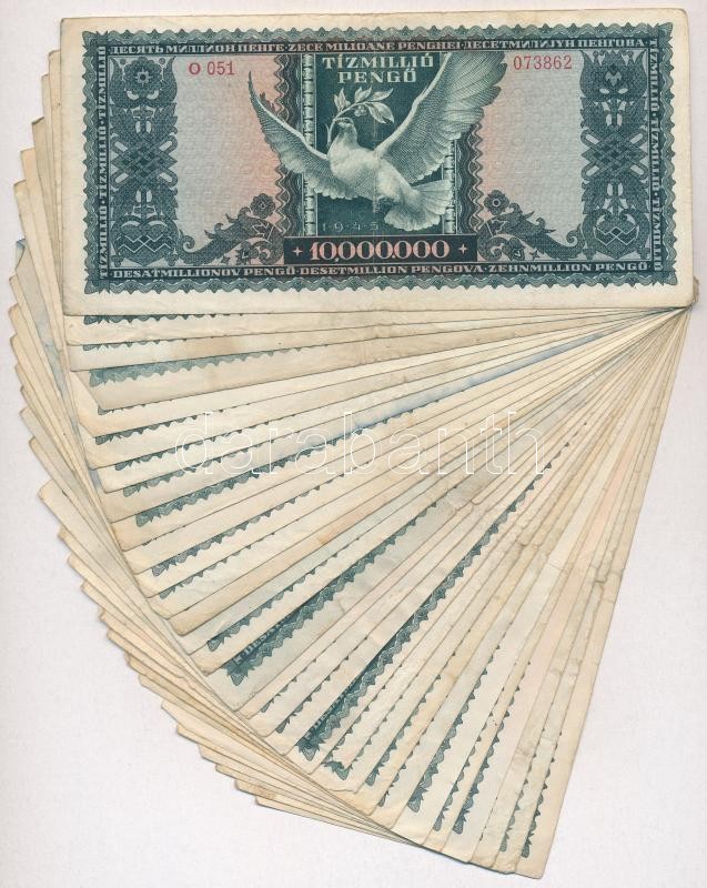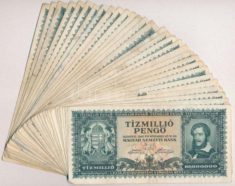 1945. 10.000.000P (30x) T:III,III- https://www.darabanth.com/de/312-Fernauktion/312.0/Numismatik/Ungarische-Banknoten~400007/1945-10000000P-30x-TIII-III-~II1704905