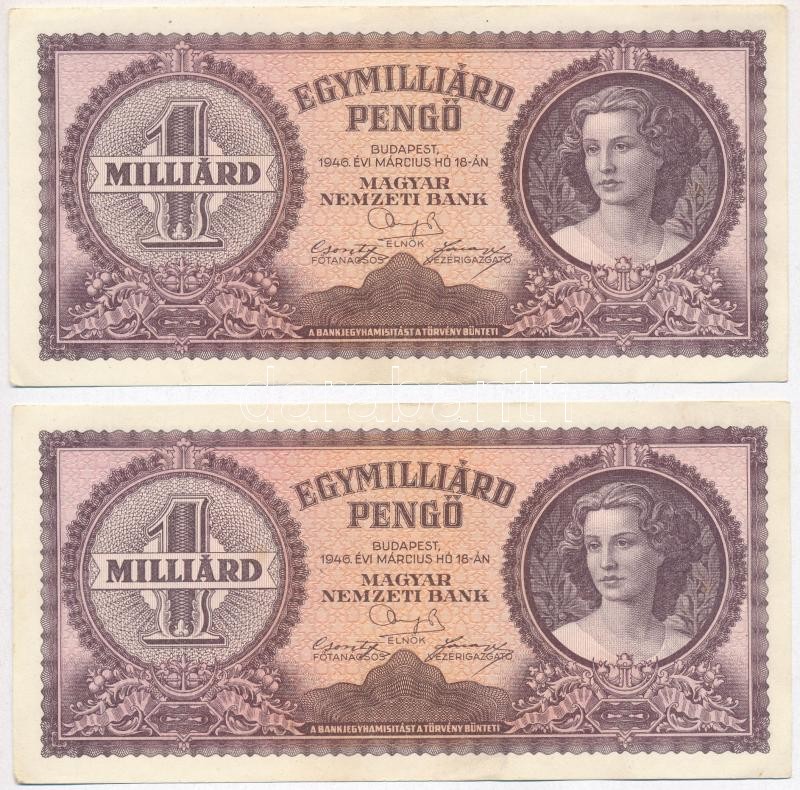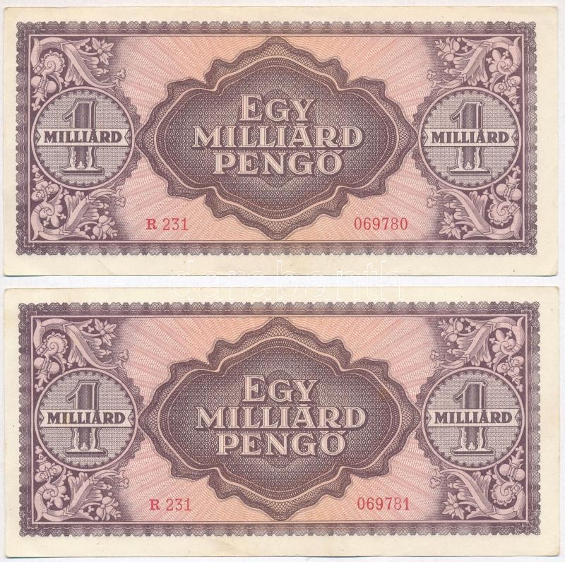 1946. 1.000.000.000P (2x) sorszámkövetők T:II https://www.darabanth.com/de/312-Fernauktion/312.0/Numismatik/Ungarische-Banknoten~400007/1946-1000000000P-2x-sorszamkovetok-TII~II1705221
