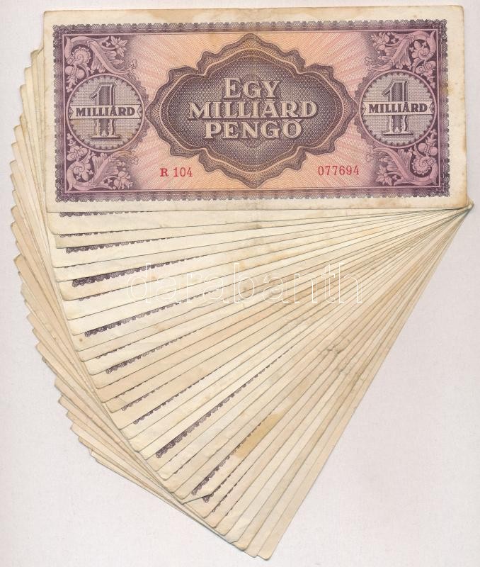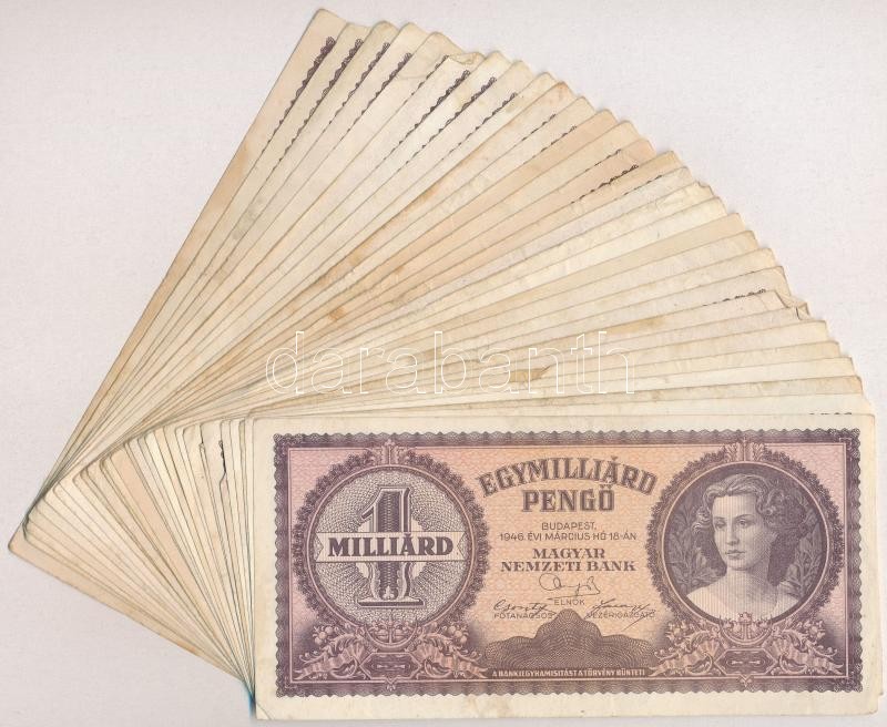 1946. 1.000.000.000P (30x) T:III,III- https://www.darabanth.com/de/312-Fernauktion/312.0/Numismatik/Ungarische-Banknoten~400007/1946-1000000000P-30x-TIII-III-~II1704918