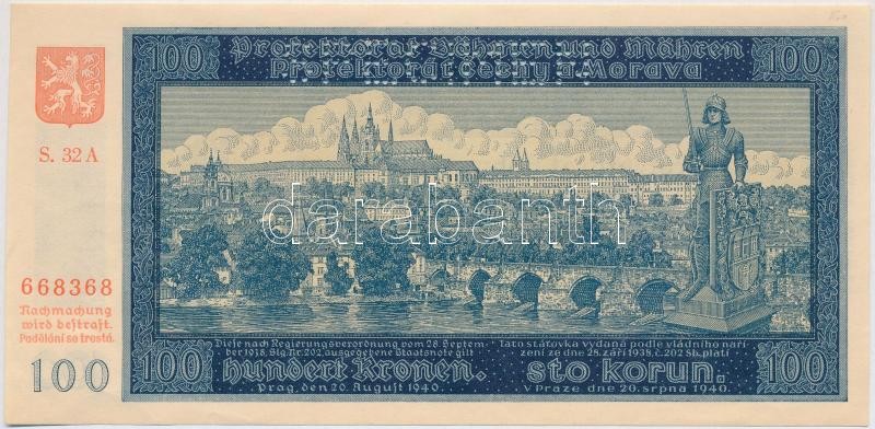 German Third Reich / Protectorate of Bohemia and Moravia 1940. 100 Korun with "SPECIMEN" perforation C:AU