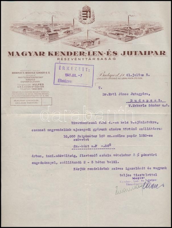 Beschreibung: 1941 Magyar Kender- Len- és Jutaipar Rt., díszes fejléces számla, 29x22,5 cm